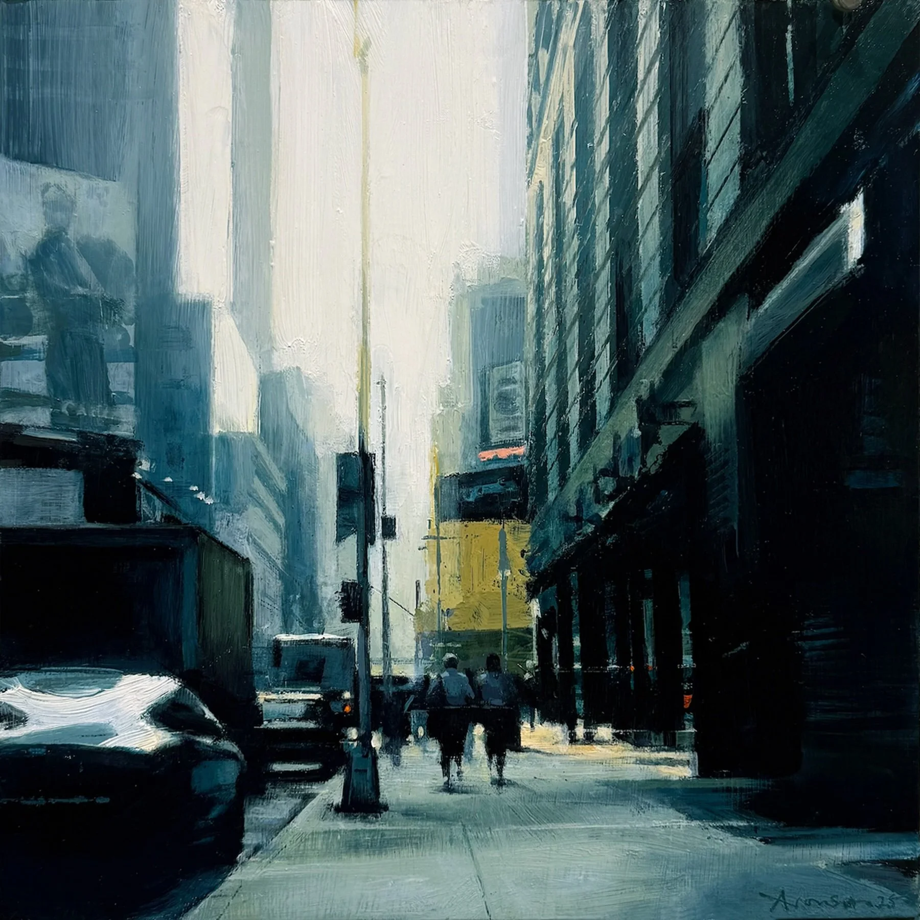 Blending realism with abstraction, his canvases reinterpret rooftops, avenues, towers, signage, and sidewalks into orchestrations of geometry, motion, and light that crystallize the essence of place. His painterly approach, at once vigorous and restrained, gives rise to a visual language both expressive and precise. “The goal,” Aronson explains, “is not simply a likeness, but the most distilled form of a powerful visual experience.”