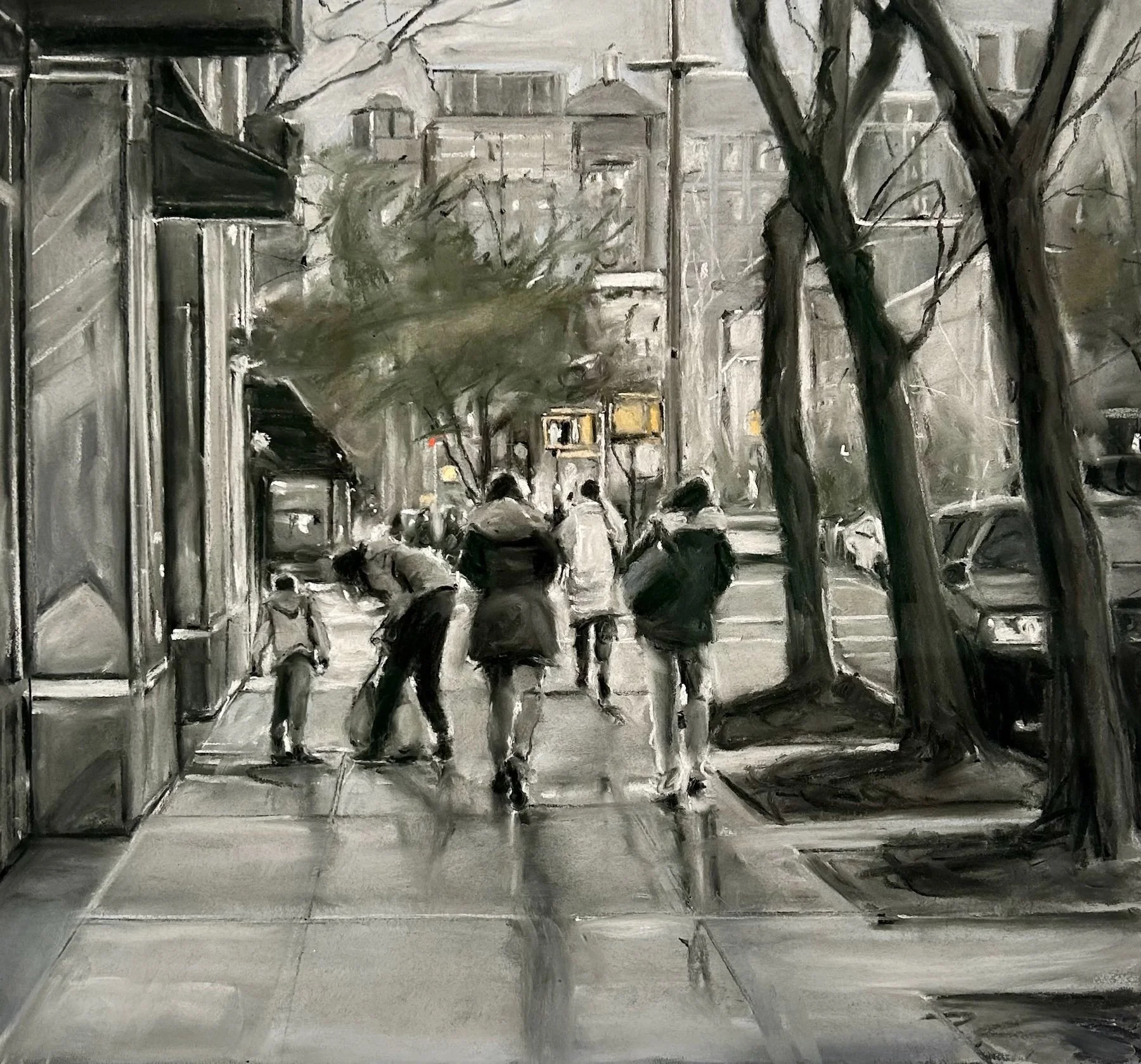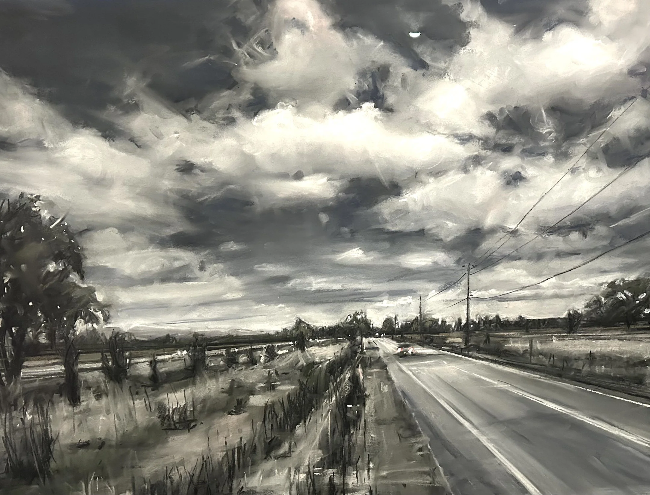 The artist’s landscapes are created to be intentionally ambiguous and allow each viewer to form an unbiased reading of the work. Although one can assume where the source material came from, there are no identifying factors– such as street signs or even faces– that allow for a singular conclusion. Her open and non-specific narratives leave the viewer with a sense of unease as it is clear that much is implied throughout the image, yet the viewer walks away without any sense of resolution.